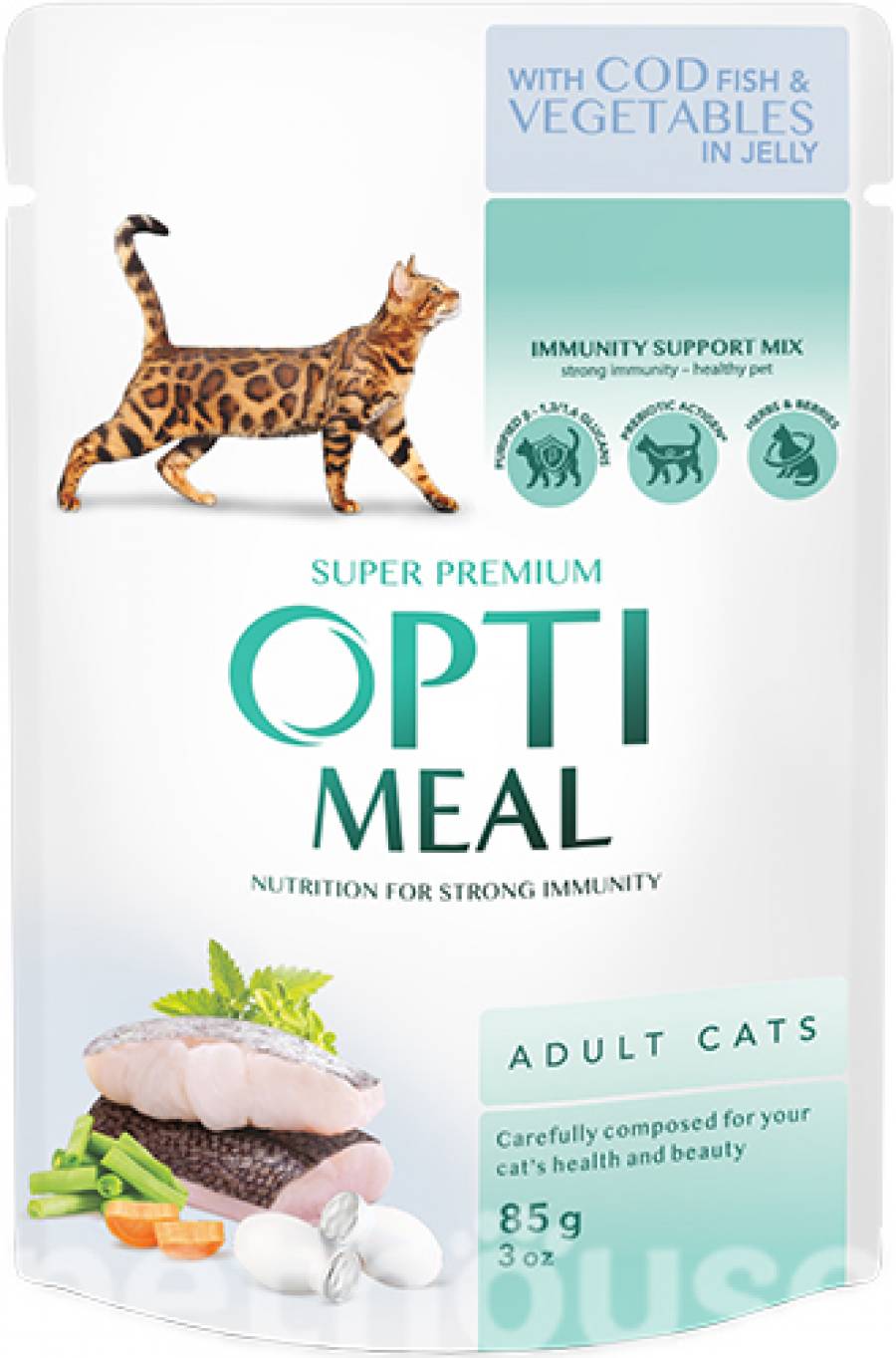 Optimeal Кусочки с треской и овощами в желе для кошек, 85 г Преимущества Optimeal с треской и овощами Высококачественный белок из трески, легкоусвояемый и гипоаллергенный. Натуральные овощи обеспечивают витамины, клетчатку и антиоксиданты. Омега-3 и Омега-6 жирные кислоты поддерживают здоровье кожи и блестящую шерсть. Пребиотики способствуют здоровому пищеварению и нормализации микрофлоры кишечника. Состав Мясо и продукты животного происхождения (треска — не менее 30%), овощи (морковь, горох, тыква), растительные белки, минеральные вещества, пребиотики, витамины (A, D3, E, B-группа), аминокислоты (таурин), антиоксиданты природного происхождения, растительные экстракты (календула, розмарин). Пищевая ценность (на 100 г продукта) Белки — 10,5% Жиры — 5,0% Зола — 2,0% Клетчатка — 0,1%
