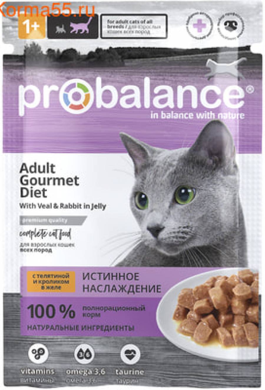 ProBalance Gourmet Diet Влажный корм для кошек с телятиной и кроликом — 85 г Преимущества ProBalance Gourmet Diet: Полноценное ежедневное питание — сбалансированный состав с идеальным соотношением белков, жиров и углеводов. Деликатное сочетание вкусов телятины и кролика — нежное мясо делает корм особенно вкусным и легко усвояемым. Здоровая кожа и блестящая шерсть — благодаря Омега-3 и Омега-6 жирным кислотам, витамину Е и биотину. Состав: Мясо и продукты животного происхождения (в том числе телятина и кролик не менее 4%), рыба и продукты переработки рыбы, растительные белки, злаки, масла и жиры, минеральные вещества, дрожжи, витамины (A, D3, E), таурин, микроэлементы (цинк, медь, марганец, йод), биотин, Омега-3 и Омега-6 жирные кислоты. Пищевая ценность (на 100 г продукта): Белки — 9,0 г Жиры — 4,0 г Зола — 2,0 г Клетчатка — 0,4 г Влага — 82 г Энергетическая ценность — около 75 ккал / 100 г
