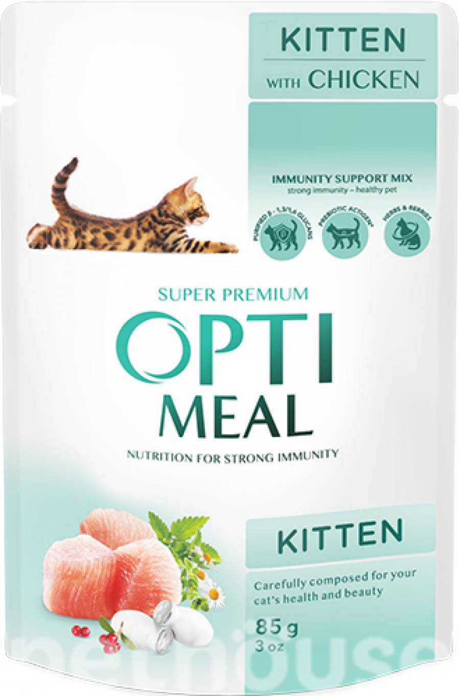 Optimeal Кусочки с курицей для котят, 85 г Преимущества Optimeal с курицей для котят Высококачественный белок из курицы — для гармоничного роста и развития мышц. Обогащён витаминами A, D3, E, B-группы для здоровья костей, зубов и иммунной системы. Содержит омега-3 и омега-6 жирные кислоты для здоровья кожи и блестящей шерсти. Пребиотики поддерживают здоровое пищеварение и микрофлору кишечника. Состав Мясо и продукты животного происхождения (курица — не менее 30%), растительные белки, минеральные вещества, пребиотики, витамины (A, D3, E, B-группаПищевая ценность (на 100 г продукта) Белки — 10,5% Жиры — 5,0% Зола — 2,0% Клетчатка — 0,1% Влага — 80% Энергетическая ценность — около 82 ккал / 100 г)