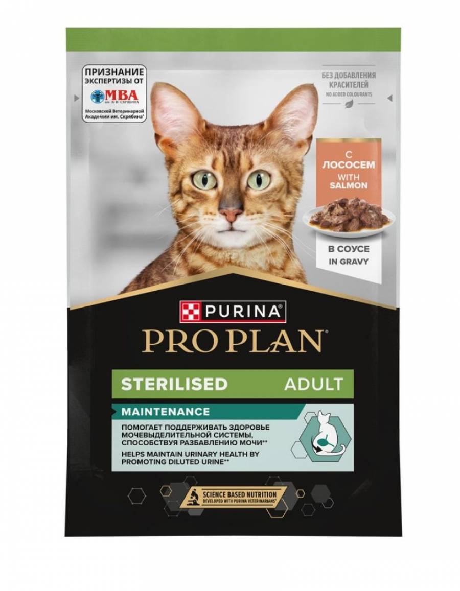 PRO PLAN Sterilised Maintenance Влажный корм для стерилизованных кошек с лососем в соусе — 85 г Преимущества PRO PLAN Sterilised Maintenance с лососем: Контроль массы тела — оптимальное соотношение белков и жиров помогает поддерживать идеальный вес стерилизованных кошек. Здоровье мочевыделительной системы — сбалансированный уровень минералов и контролируемый pH мочи способствуют профилактике мочекаменной болезни. Поддержка иммунитета — витамины A, D3, E, C и таурин укрепляют защитные силы организма. Блестящая шерсть и здоровая кожа — благодаря натуральным Омега-3 и Омега-6 жирным кислотам из лосося. Состав: Мясо и продукты переработки мяса, рыба и продукты переработки рыбы (в том числе лосось не менее 4%), растительные белки, злаки, масла и жиры, минеральные вещества, витамины (A, D3, E), таурин, микроэлементы (цинк, медь, марганец, йод), Омега-3 и Омега-6 жирные кислоты, антиоксиданты. Пищевая ценность (на 100 г продукта): Белки — 11,5 г Жиры — 2,5 г Зола — 2,0 г Клетчатка — 0,3 г Влага — 80 г Энергетическая ценность — около 75 ккал / 100 г