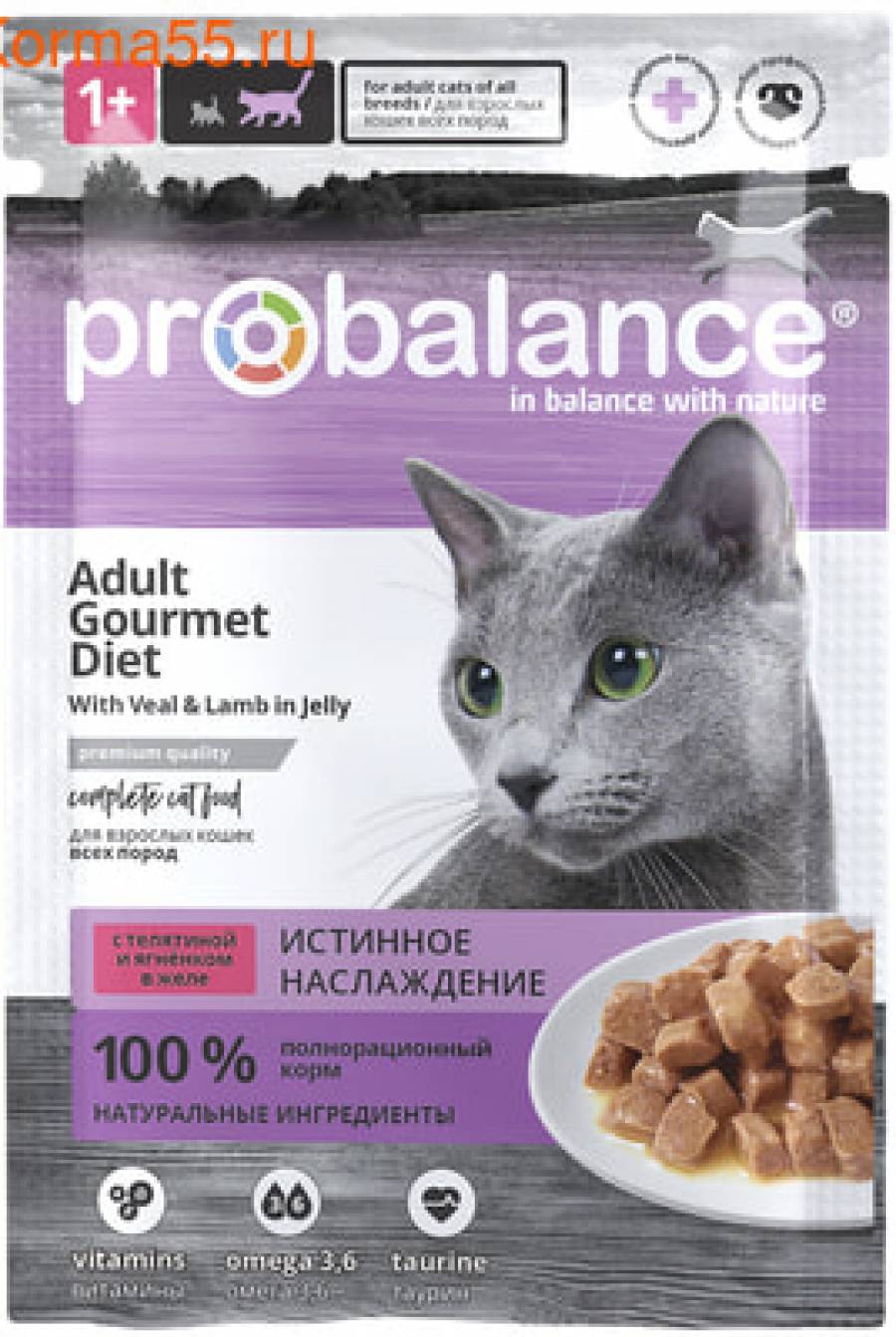 ProBalance Gourmet Diet Влажный корм для кошек с телятиной и ягнёнком — 85 г Преимущества ProBalance Gourmet Diet с телятиной и ягнёнком: Полноценный рацион для здоровья кошки — содержит все необходимые питательные вещества, витамины и минералы. Нежная текстура и превосходный вкус — идеально подходит даже для привередливых питомцев. Здоровая кожа и блестящая шерсть — благодаря Омега-3 и Омега-6 жирным кислотам, витамину E и цинку. Состав: Мясо и продукты животного происхождения (в том числе телятина и ягнёнок не менее 4%), рыба и продукты переработки рыбы, растительные белки, злаки, масла и жиры, минеральные вещества, дрожжи, витамины (A, D3, E), таурин, микроэлементы (цинк, медь, марганец, йод), Омега-3 и Омега-6 жирные кислоты, биотин, антиоксиданты. Пищевая ценность (на 100 г продукта): Белки — 9,0 г Жиры — 4,0 г Зола — 2,0 г Клетчатка — 0,4 г Влага — 82 г Энергетическая ценность — около 75 ккал / 100 г